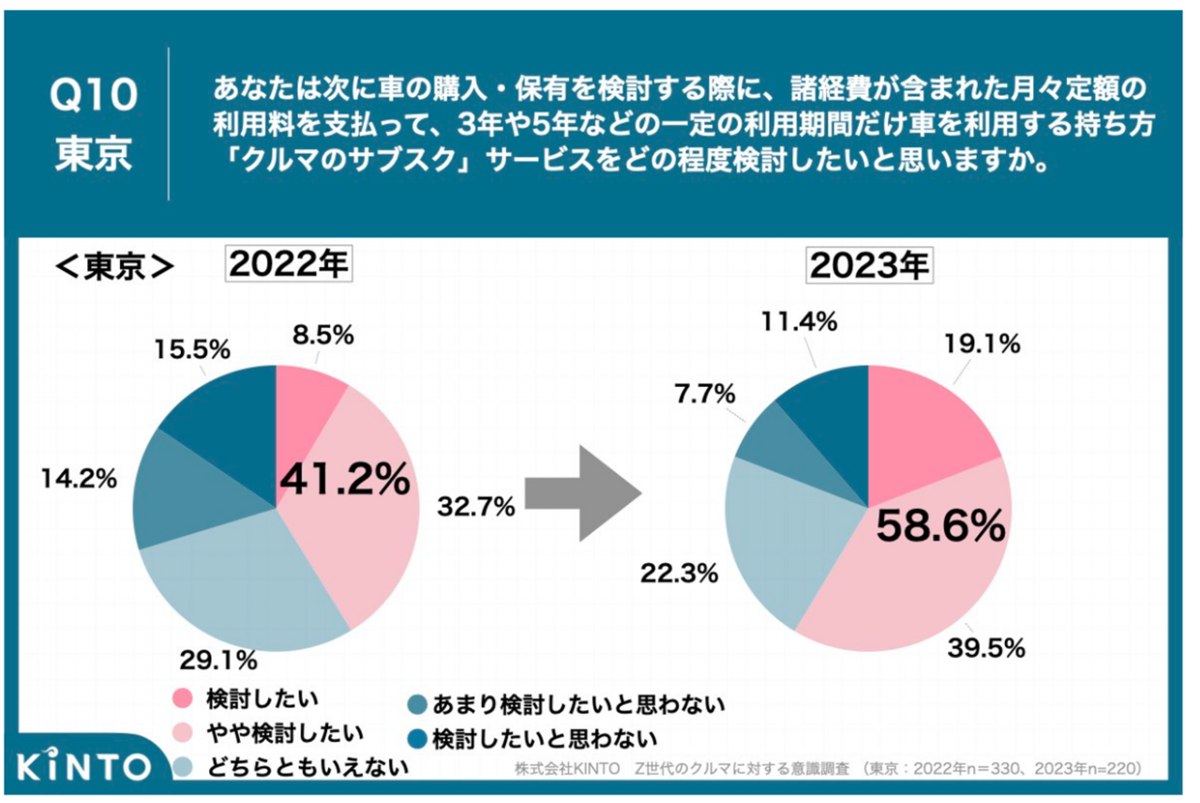 *4:若者のクルマ離れ、都内Z世代の約6割が「自覚あり」一方で地方Z世代は約7割が「自覚なし」に クルマの「サブスク」を検討したい都内Z世代は58.6%、昨年より17.4ポイント増で意向高まる結果に|株式会社KINTO
